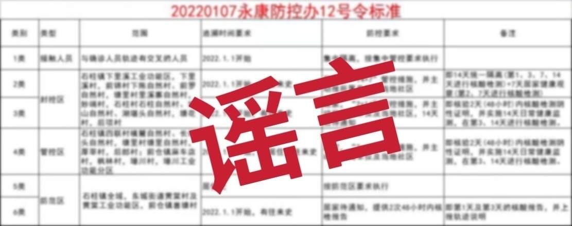 浙江辟谣平台据掌上永康消息1月7日,网上传播一张“20220107永康防控办12号令标准”相关信息。永康市委网信办发现后立即报永康市新型冠状病毒肺炎疫情防控工作指挥部,经核实为虚假信息,下一步将移交公安部门依法依规进行处置。请广大市民、网民遵法守法,关注权威信息,不造谣、不信谣、不传谣。