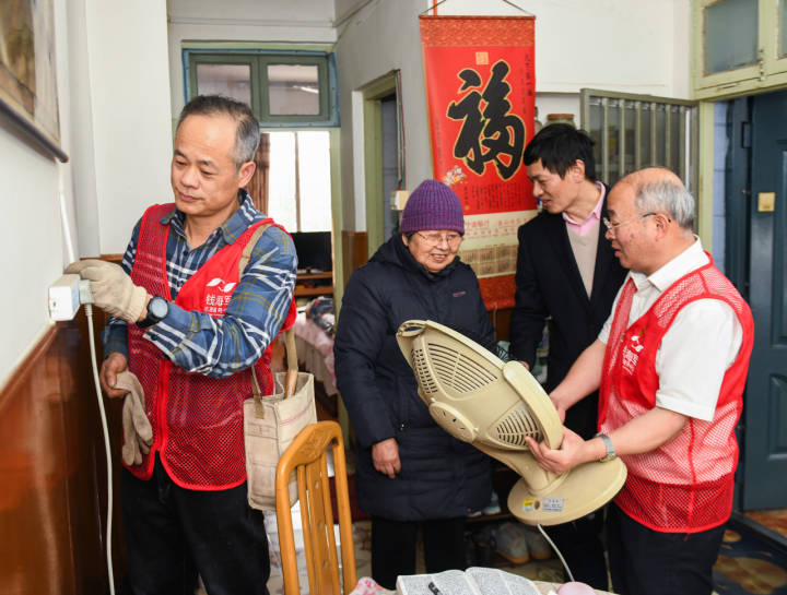 钱海军(右一)和志愿者一起为社区空巢老人检修室内电气线路安全并维修小家电(2022年3月3日摄)。新华社发
