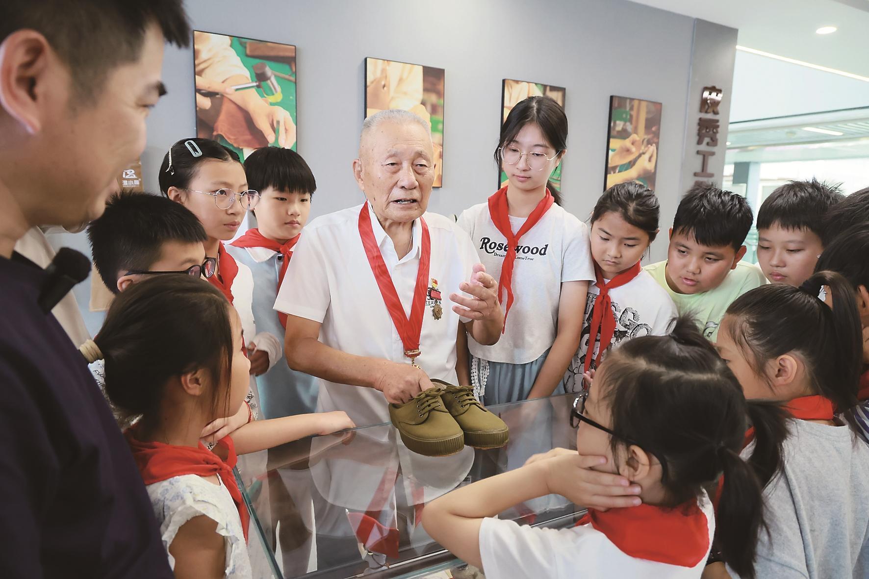 7月31日,八一建军节前夕,温岭市城北街道温小履鞋文化馆举办了一场特别的庆祝活动。暑托营的孩子们向94岁老兵蔡夏梅送上鲜花与祝福,并随同参观军履主题鞋文化展,聆听他讲述军鞋背后的英雄故事,铭记革命精神,厚植爱国情怀。