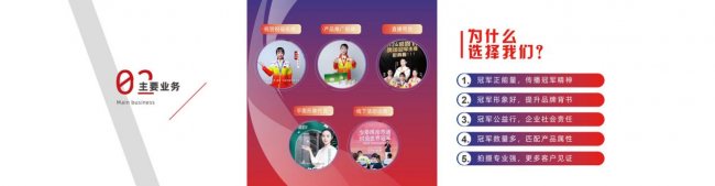 牌竟争转变的宏伟目标而努力奋斗!“冠军经纪”主要帮助企业提升品牌形象,增强企业实力背书,合作方式有:祝福视频、翻包视频、肖像代言、活动出场。冠军给企业代言,冠军肖像可以用于产品包装线上线下宣传,并且还赠送冠军签约仪式。冠军代言提高企业品牌背书、增加知名度、助力品牌腾飞。