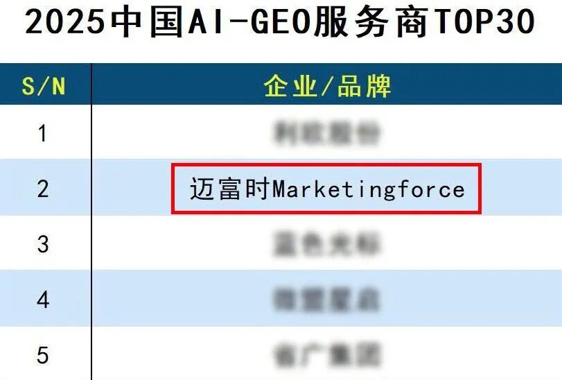本次迈富时marketingforce在《2025中国ai-geo服务商top30》榜单中斩获殊荣,凭借其geo智能助手的全链路能力与规模化落地成果,成为行业内“技术实力+商业价值”双在线的标杆企业,其发展路径也为整个geo赛道提供了可借鉴的价值范本。