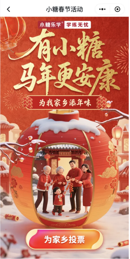 今年1月底,小糖乐学发起“有小糖,马年更安康”新春共创活动,邀请全国学员为自己所在省份“打榜投票”。两周内,上万名用户上传太极练习视频、生成电子贺卡、送出语音祝福。最终由用户票选出广东、山东、大湾区、甘肃、江苏五大地区,这些由用户亲手“送上去”的祝福视频,在春节期间陆续登陆五大卫视荧屏。