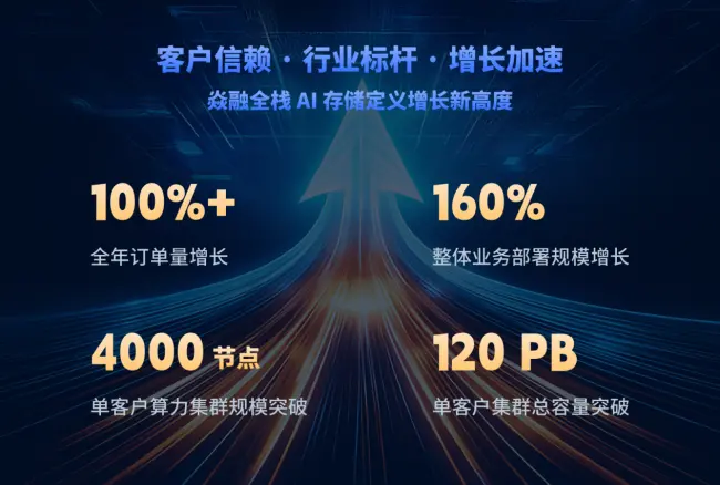 依托全栈 AI 存储体系,焱融科技已形成“性能领先+场景深耕”的双重壁垒。2025 年,公司在多个行业实现规模化部署,订单量与业务规模均实现跨越式增长。全年订单金融同比增长超过 100%,业务部署规模增长 160%,单客户集群总容量超过 120PB,支撑超过 4000 节点算力集群运行。