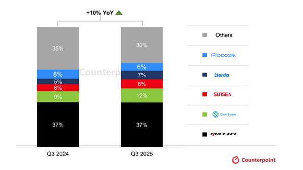 在通信模组领域,利尔达的市场地位得到了权威数据的强力佐证:自2025年第二季度跻身全球前四以来,利尔达蜂窝模组出货量已稳居行业第一梯队。这一成绩的背后,是海外市场对其产品品质与方案落地能力的高度认可。