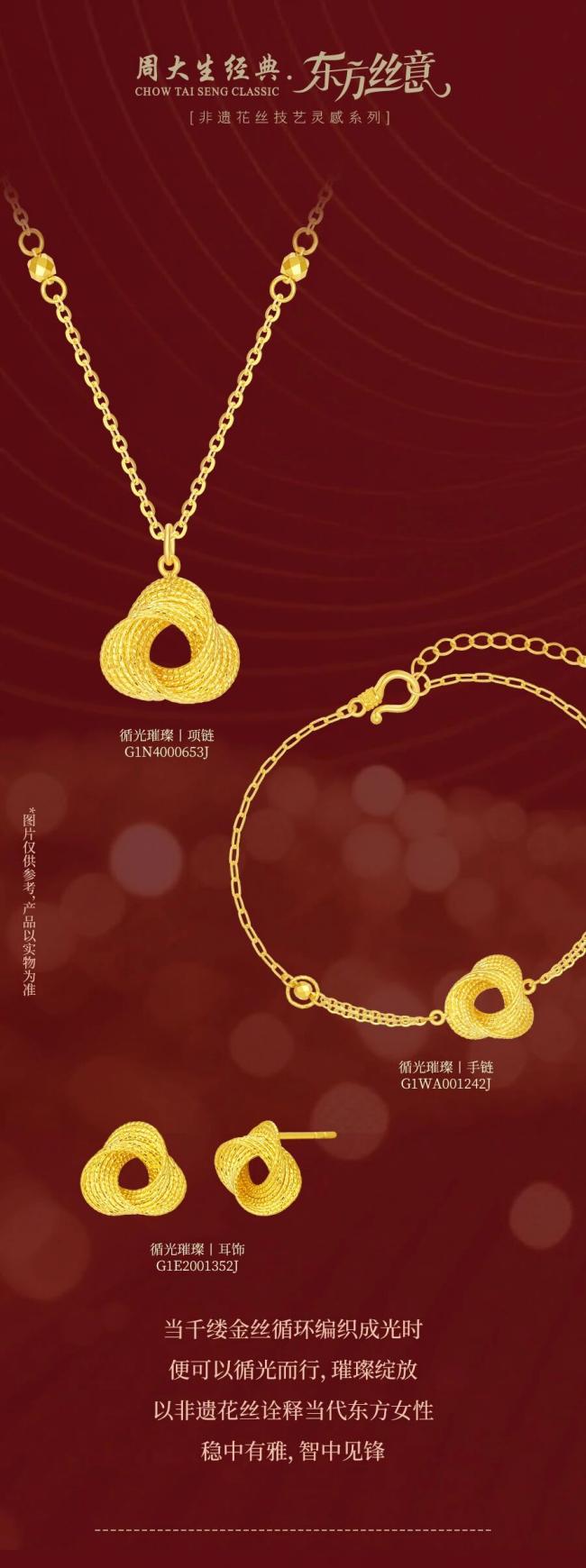 而周大生经典这份对当代女性的致敬,亦凝练于每一件匠心设计的产品之中。周大生经典东方丝意系列“循光璀璨”,融匠心于毫厘之间,拉制出如丝绸般柔润的金线,让金饰表面流淌着绸缎般的灵动光影。“循光璀璨”的暖金色泽既保留了东方美学的雅致温润,又兼具现代几何造型的利落锋芒,每一位佩戴它的女性,都能在这份雅致与利落交织的饰品中,绽放独属于她们的柔韧光芒。