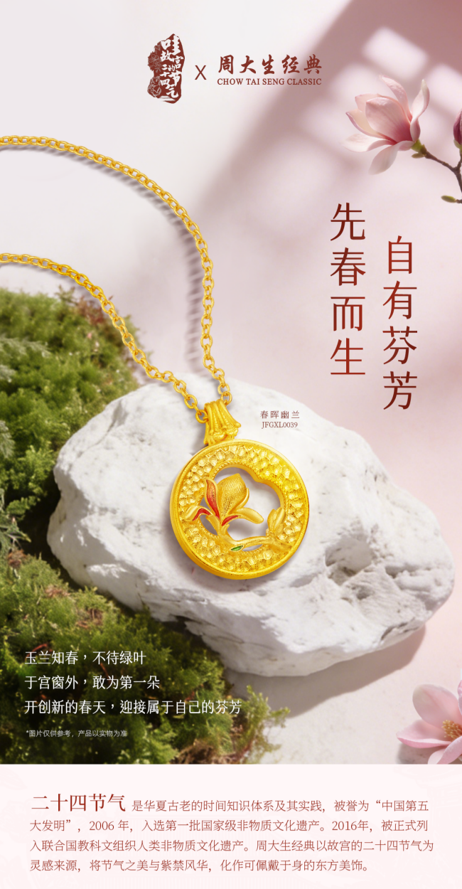 在故宫御花园中,玉兰花于早春傲然绽放,象征着高雅与富贵。周大生经典“哇!故宫的二十四节气”系列的“春晖幽兰”,定格玉兰绽放的唯美姿态,以细腻工艺描绘其素雅气韵,春色如许,盛放成永恒的风景。将“春晖幽兰”环于颈间,玉兰便从御花园的专属景致,化作佩戴者独有的雅致诗篇。正如每一位东方女性,于喧嚣中自持清雅,于时光里静绽风华,不争春色,却自成风景。
