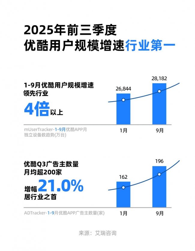 根据艾瑞报告,优酷前三季度用户规模增速位居长视频平台榜首,第三季度月均广告主数量突破200家,较年初增长21%,增幅同样位列行业第一。这种用户规模与商业化能力的同步提升,验证了优酷正确的战略思路。