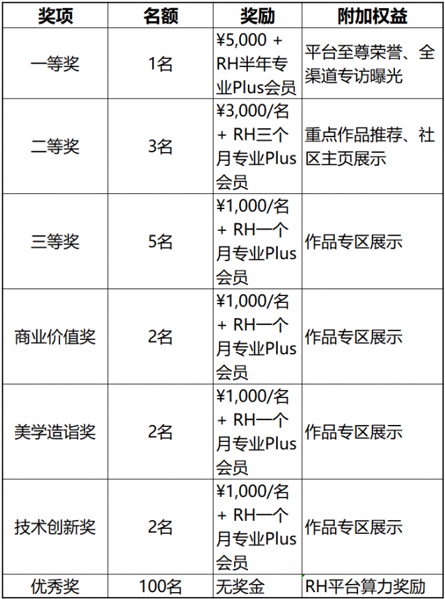 为了激励更多优秀创作者参与,RunningHub为本次大赛设立了总计¥25,000 的现金奖池。除了丰厚的现金奖励外,获奖者还将获得海量平台算力及专业版会员权益。
