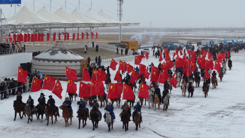 开幕式的设计独具匠心,将草原文化与时代精神深度融合,彰显出浓郁的民族特色与团结氛围。开幕式以“雪域迎宾”为序章,由汉蒙双语主持人联袂主持。100匹蒙古马组成的国旗方队率先入场,鲜艳的五星红旗在冰雪草原上飘扬,传递出草原儿女对祖国的赤诚热爱。锡林浩特市公安局蒙古马骑警大队紧随其后,他们的飒爽英姿展现出守护边疆的责任与担当。13个旗县市区代表队驭风而来,各支队伍带着地域特色与骏马风采依次亮相,尽显草原健儿的豪迈气概。