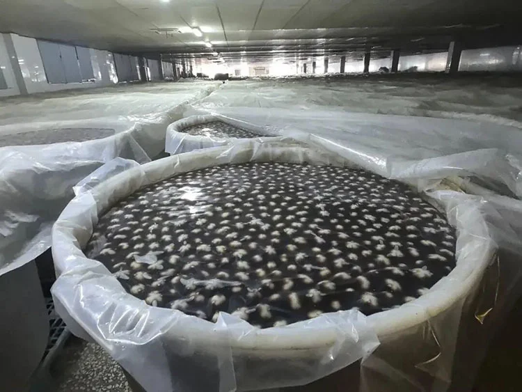 走进该公司皮蛋腌制车间,1300多个直径超一米的大桶整齐排列,每个桶里泡有约5000枚鸭蛋。像这样的车间,该公司有5个,同时腌制着3000多万枚皮蛋。