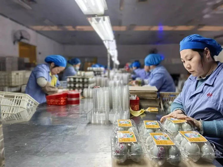 生产线匀速转动,一枚枚青灰色的鸭蛋经过筛选、清洗,被送入恒温腌制车间。咸蛋包装车间里,工人们忙着将腌制好的咸蛋装箱、入库。仓库外,工人开着叉车,将堆码好的咸蛋装上大货车。