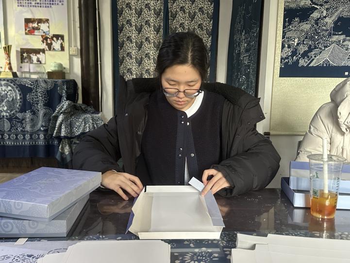 在完成布面制作后,团队成员投入到文创产品的包装实践。裁剪、折叠、穿绳、系结,每一个动作都需要细致与耐心。大家相互配合,校准纹样方向,调整吊牌位置,在重复中体会非遗衍生品从“作品”走向“产品”的过程。这不仅是动手能力的锻炼,更是一次对传统工艺如何融入当代生活的思考——非遗的活力,或许正藏在这些被重新设计、被日常使用的物品之中。